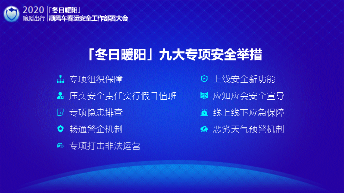 春運(yùn)出行,安全第一,嘀嗒出行于2019年12月24日正式啟動(dòng)「冬日暖陽(yáng)」順風(fēng)車(chē)春運(yùn)安全專(zhuān)項(xiàng)行動(dòng)計(jì)劃,聯(lián)合中國(guó)交通頻道在10省交管的聯(lián)合指導(dǎo)下,部署九大安全舉措,包括上線安全新功能,打擊非法營(yíng)運(yùn),加強(qiáng)用戶(hù)安全宣導(dǎo)等,公司上下嚴(yán)陣以待,全方位守護(hù)用戶(hù)的安全,安心地返鄉(xiāng)和返程。