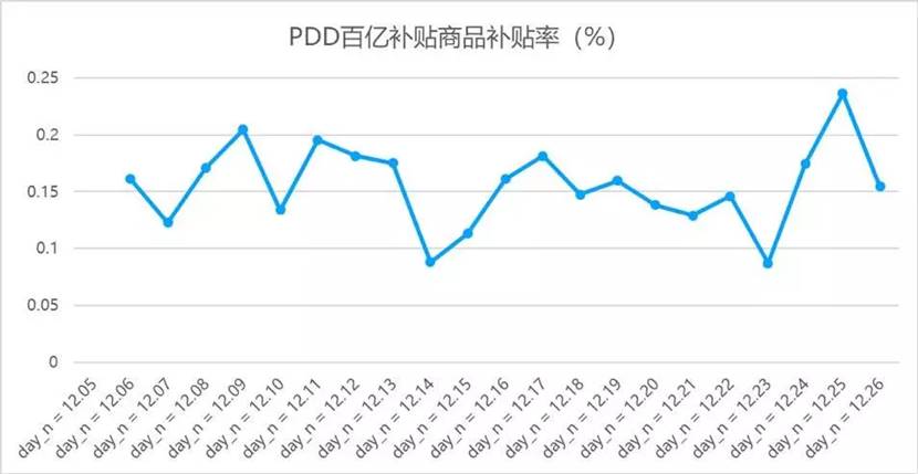 該報(bào)告截取了拼多多2019年12月5日至12月25日期間百億補(bǔ)貼商品和整體GMV數(shù)據(jù),整個(gè)考察期內(nèi),平臺(tái)補(bǔ)貼商品最高的五個(gè)類目為:百貨、小家電、食品、母嬰和精選商品。