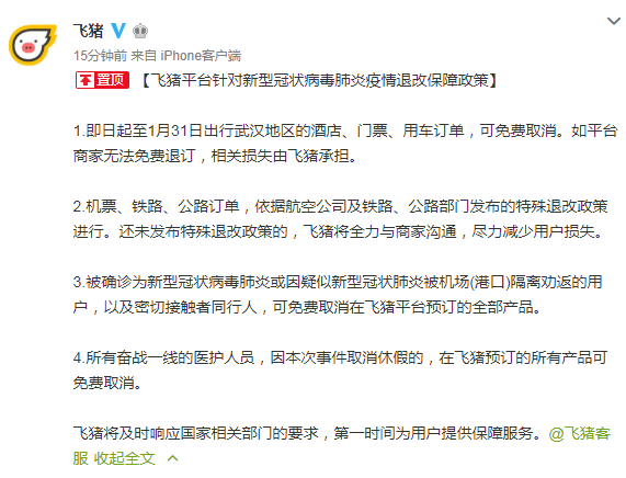 政策顯示,即日起至1月31日出行武漢地區的酒店、門票、用車訂單,可免費取消。如平臺商家無法免費退訂,相關損失由飛豬承擔。