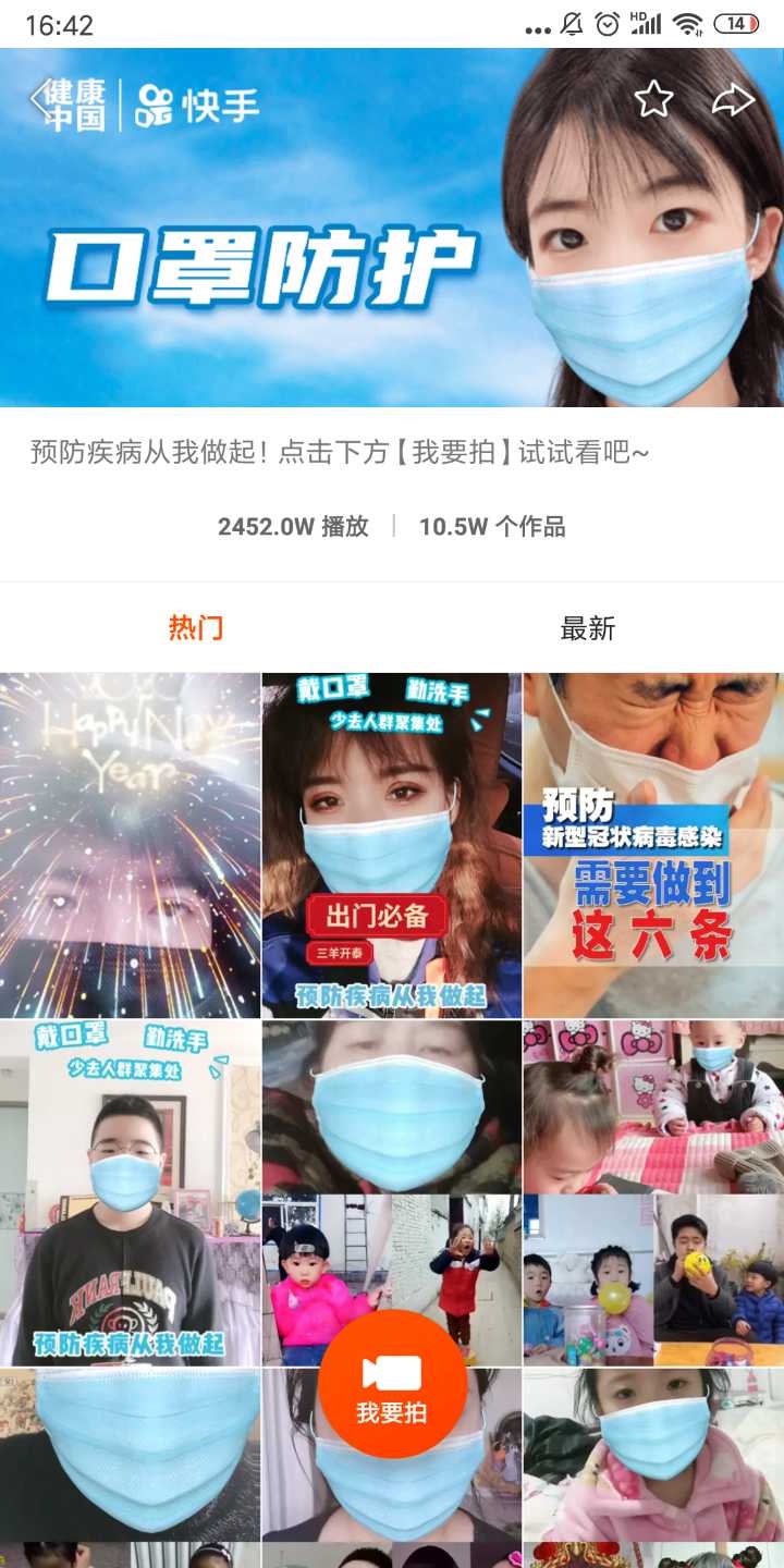 除了內容運營,快手方面還發起了端內運營活動。與衛健委聯合發起#一起戴口罩#打卡活動,號召全民注重健康安全,鼓勵公眾每天戴口罩,共同營造一個對自己、對社會負責的公共氛圍。