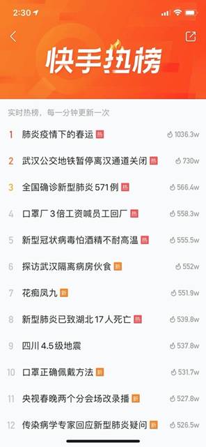 打開快手搜索框,可以看到快手熱榜。23日下午2時許,速途網打開榜單,發現前12條有10條與疫情相關。點擊對應詞條后,可以看到對應相關視頻。快手熱榜運營人員稱,3天來,快手熱榜持續動態關注疫情事件,根據用戶需求和內容熱度,聚合上線了50余條熱詞。其中,熱度最高的熱詞有“武漢加油”、“ 女醫生寫家書請戰新型肺炎”、“ ECMO技術成功救治一患者”、“ 首例重癥新型肺炎患者發聲”等內容。
