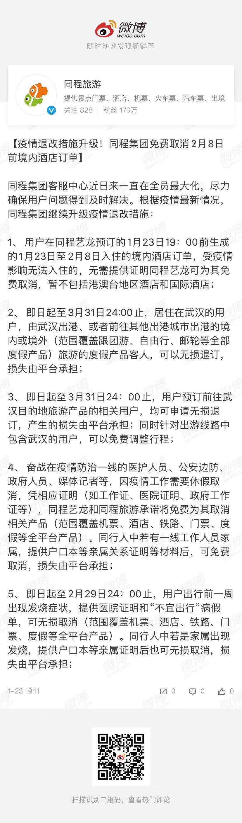 速途網訊 同程集團宣布升級疫情保障措施,用戶在同程藝龍預訂的1月23日19:00前生成的1月23日至2月8日入住的境內酒店訂單,可免費取消。即日起至3月31日24:00止,武漢地區以及預訂前往武漢目的地旅游產品的相關用戶,均可申請無損退訂,奮戰在疫情防治一線的醫護人員、公安邊防、政府人員、媒體記者等,因疫情工作需要休假取消,憑相應證明(如工作證、醫院證明、政府工作證等),同程藝龍和同程旅游承諾將免費為其取消相關產品(范圍覆蓋機票、酒店、鐵路、門票、度假等全平臺產品)。