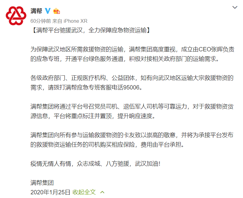 速途網(wǎng)訊 今日,@滿幫 集團表示,為保障武漢地區(qū)所需救援物資的運輸,滿幫集團高度重視,成立由CEO張暉負責的應(yīng)急專班,開通平臺綠色服務(wù)通道,積極對接相關(guān)政府部門的運輸需求。各級政府部門、正規(guī)醫(yī)療機構(gòu)、公益團體,如有向武漢地區(qū)運輸大宗救援物資的需求,請撥打滿幫應(yīng)急專班客服電話95006。同時,滿幫集團將通過平臺號召黨員司機、退伍軍人司機等可靠運力,對于救援物資貨源信息,平臺將重點標注并置頂,提升響應(yīng)速度。此外,滿幫集團向所有參與運輸救援物資的卡友致以崇高的敬意,并將為承接平臺發(fā)布的救援物資運輸任務(wù)的司機購買相應(yīng)保險,費用由平臺承擔。