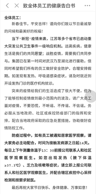 由于目前疫情防控正處于關鍵期,1月26日,蘇寧在發(fā)給員工的《健康告白書》里,再次呼吁員工做好安全防護,合理安排假期,服從當?shù)卣?span id="g2myngt" class="wpcom_keyword_link">社區(qū)、疾控防疫部門的安排,如發(fā)現(xiàn)有發(fā)熱、呼吸道感染癥狀,及時就近到開設發(fā)熱門診的醫(yī)療機構就診。