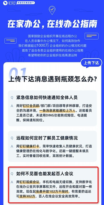 速途網訊 為保障企業組織、教育醫療和政府機構“網上辦公”需求,阿里巴巴釘釘緊急發布“在家辦公、在線辦公指南”。其中釘釘視頻會議免費升級至102方,且免費開放不限時,最高可免費支持302方同時參與。據悉,釘釘視頻會議操作簡易,可以一鍵發起,1080P高清畫質,PC端、手機端畫面自由切換,還可以在屏幕上實時共享文件。此外,為應對疫情,協助企業組織防控防疫,釘釘緊急開發,于1月29日凌晨5點全量發布了員工智能健康管理產品。(李楠)