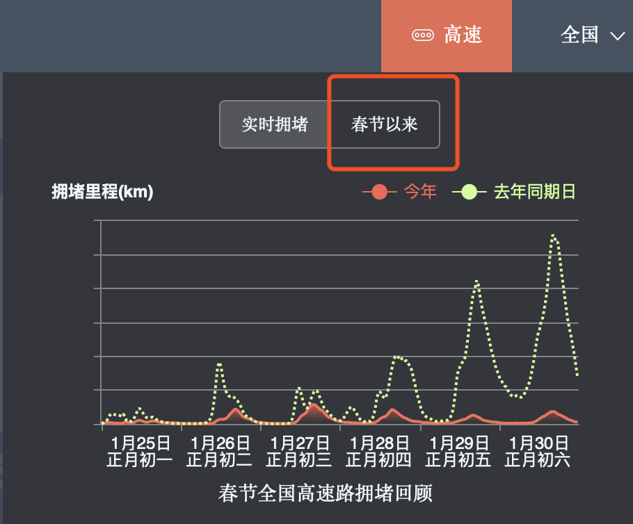 此外,李瑩還運用百度地圖新上線的實時路況平臺,從遷徙平臺上點擊全國路況便可進入此平臺。可以看到,往年全國高速擁堵常常出現(xiàn)在大年初六,今年的初六(紅線)高速出行并不突出。用戶通過此平臺可實時查看全國高速擁堵趨勢變化和擁堵路段排行、熱門交通樞紐的人流指數(shù)分析和周邊擁堵情況。