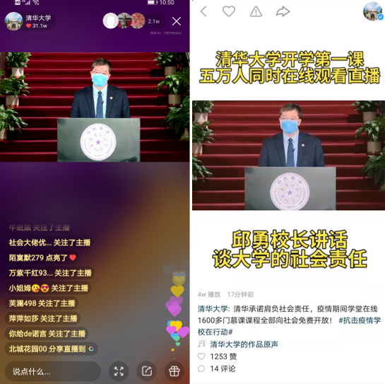 2月3日上午10:00,清華大學(xué)以在線直播的方式,通過清華大學(xué)快手號(快手ID:1087936424)、雨課堂平臺、人民日報客戶端和清華大學(xué)官方微博等多個渠道,與全校師生同上一堂特殊的“開學(xué)第一課”。“開學(xué)第一課”持續(xù)了1小時50分鐘,清華大學(xué)黨委書記陳旭介紹了清華大學(xué)的疫情防控情況,校長邱勇則向師生們同步疫情防控期間清華大學(xué)的教學(xué)模式調(diào)整為遠程線上教學(xué)等相關(guān)教學(xué)安排。