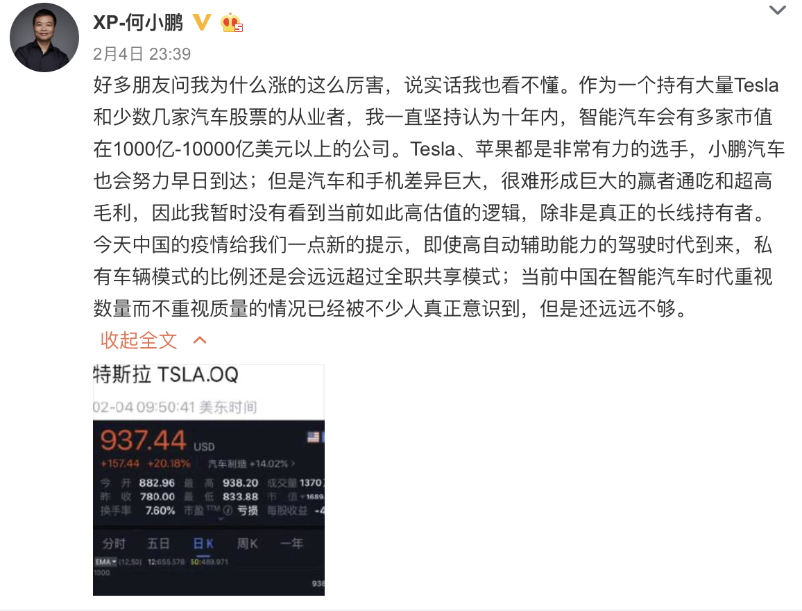 “大敵”當前,但國內智能車企面對競爭仍然保持著相對樂觀的態度。小鵬汽車的創始人何小鵬發文評價特斯拉股價大漲,他認為,汽車和手機差異巨大,很難形成巨大的贏者通吃和超高毛利,因此暫時沒有看到當前如此高估值的邏輯;即使高自動輔助能力的駕駛時代到來,私有車輛模式的比例還是會遠遠超過全職共享模式。