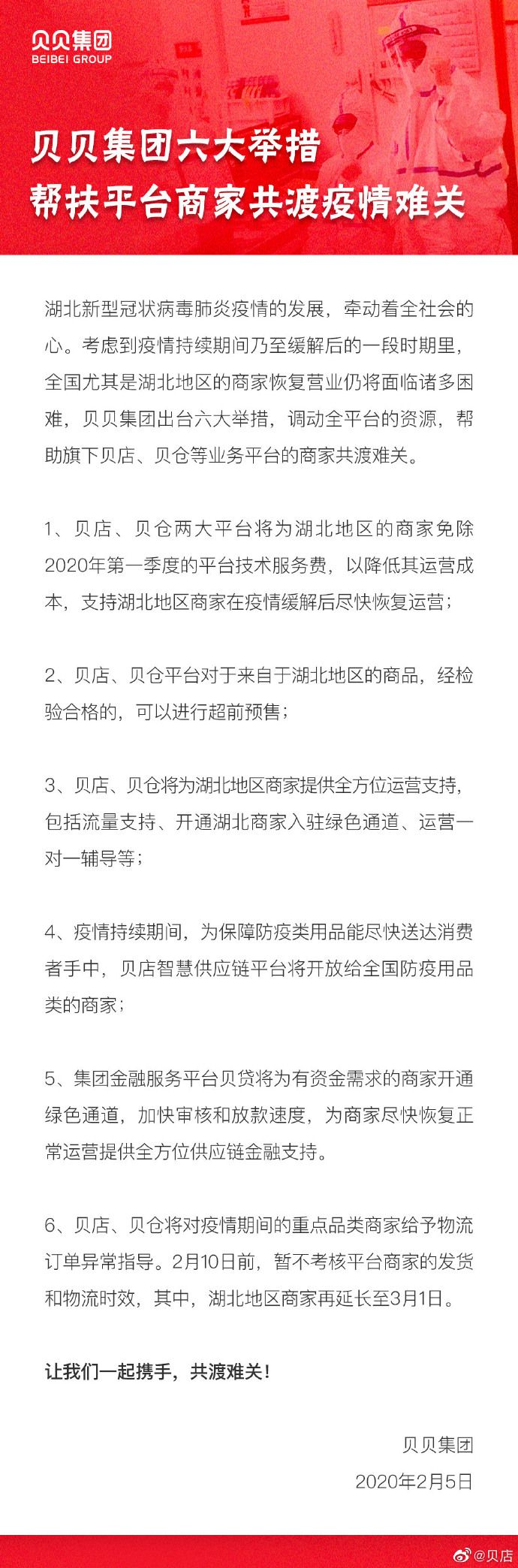 速途網(wǎng)訊 今日,貝貝集團出臺六大舉措,幫扶旗下貝店、貝倉等業(yè)務(wù)平臺的商家。據(jù)悉,這六大舉措包括:貝店、貝倉兩大平臺將為湖北地區(qū)的商家免除2020年第一季度的平臺技術(shù)服務(wù)費;來自于湖北地區(qū)的商品,經(jīng)檢驗合格的,可進行超前預(yù)售;為湖北地區(qū)商家提供全方位運營支持;貝店智慧供應(yīng)鏈平臺將開放給全國防疫用品類的商家; 集團金融服務(wù)平臺貝貸將開通綠色通道;貝店、貝倉將對疫情期間的重點品類商家給予物流訂單異常指導(dǎo)。