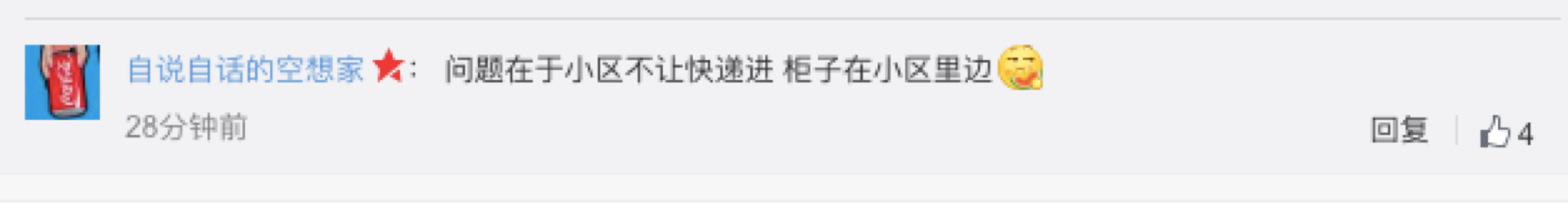此外,也有用戶提出,并不是每一個小區的快遞柜都在小區門口,當小區限制快遞、外賣配送人員進出時,這一操作實用性并不高。