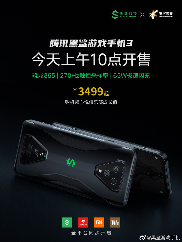 目前,騰訊黑鯊游戲手機3已在黑鯊商城、小米商城、京東商城、小米有品及順電等銷售平臺開啟首銷,起售價為3499元,感興趣的朋友們千萬不要錯過這款2020年首款5G游戲手機!