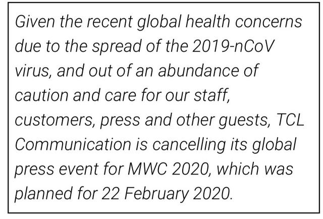 速途網訊 據IT之家報道,TCL通訊昨日發布公告,鑒于2019新型冠狀病毒波及甚廣,并由此引發國際社會對公眾健康的深切擔憂,出于對員工、顧客、媒體及來賓個人健康安全的考慮,TCL通訊決定取消原定于2020年2月22日舉行的MWC 2020全球新聞發布會。MWC 2020期間的其他活動仍照常進行,不受影響。