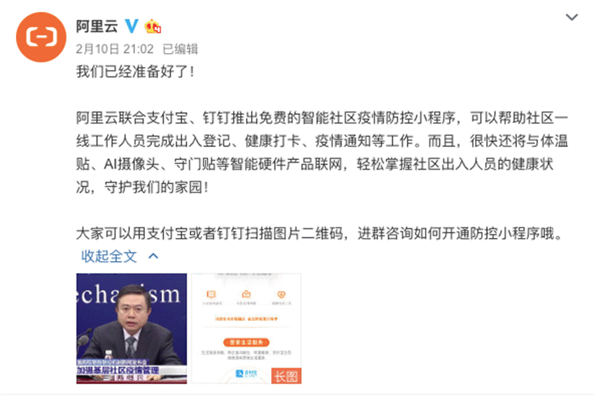 當晚,阿里云在微博上回應這一建議,稱“我們已經準備好了”,并拿出了一款免費的社區(qū)智能防疫小程序。據介紹,這款小程序是與支付寶、釘釘聯合開發(fā),在開通后,社區(qū)一線工作人員可以利用支付寶、釘釘等app在線完成居民出入登記、健康打卡、疫情通知等工作,物業(yè)及街道辦下發(fā)通知也可以通過支付寶,釘釘,短信息多維度觸達業(yè)主。除了在線管理的基本功能外,很快這套小程序還將與體溫貼、AI攝像頭、守門貼等智能硬件產品進行聯網,幫助社區(qū)防控的基層人員足不出戶就可以掌握社區(qū)人員及出入人員的健康狀況。