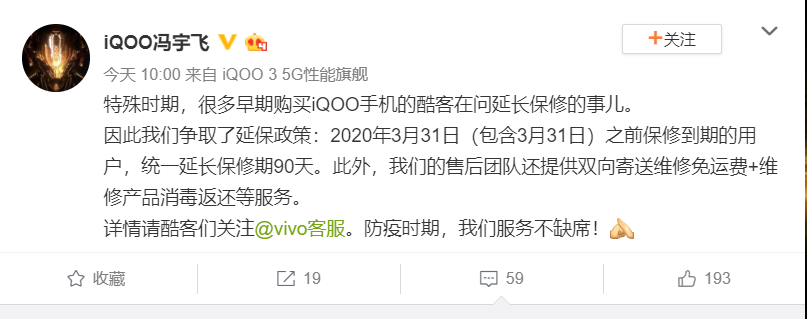 速途網(wǎng)訊 今日,iQOO品牌副總裁馮宇飛在微博宣布新的延保政策:2020年3月31日(包含3月31日)之前保修到期的用戶,統(tǒng)一延長保修期90天。此外,iQOO售后團(tuán)隊(duì)還提供雙向寄送維修免運(yùn)費(fèi)+維修產(chǎn)品消毒返還等服務(wù)。