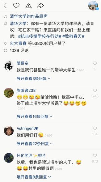 與清華大學宣傳部合作,推出“宅家充電”、“宅家”云學堂等系列直播,目前已直播38場,總觀看量超3100萬,總點贊489萬,邀請校內外名師大家,課程覆蓋國際關系、創(chuàng)新創(chuàng)業(yè)、公眾表達、心理健康、傳統(tǒng)文化、藝術賞析等多個方面。