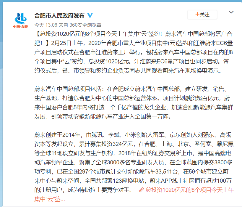 速途網(wǎng)訊 今日,據(jù)合肥市人民政府發(fā)布的信息顯示,2020年合肥市重大產(chǎn)業(yè)項(xiàng)目集中(云)簽約和江淮蔚來EC6量產(chǎn)項(xiàng)目啟動儀式在合肥市江淮蔚來工廠舉行。包括蔚來汽車中國總部項(xiàng)目在內(nèi)的8個項(xiàng)目集中“云”簽約,總投資1020億元。江淮蔚來EC6量產(chǎn)項(xiàng)目也同步啟動。據(jù)悉,蔚來汽車中國總部項(xiàng)目包括:在合肥成立蔚來汽車中國總部,建立研發(fā)、銷售、生產(chǎn)基地,打造以合肥為中心的中國總部運(yùn)營體系。項(xiàng)目計(jì)劃融資超百億元,蔚來中國落戶合肥5年內(nèi)將打造一個千億產(chǎn)值的龍頭企業(yè),加速合肥新能源汽車集群發(fā)展,引領(lǐng)帶動安徽新能源汽車產(chǎn)業(yè)進(jìn)入全國第一方陣。