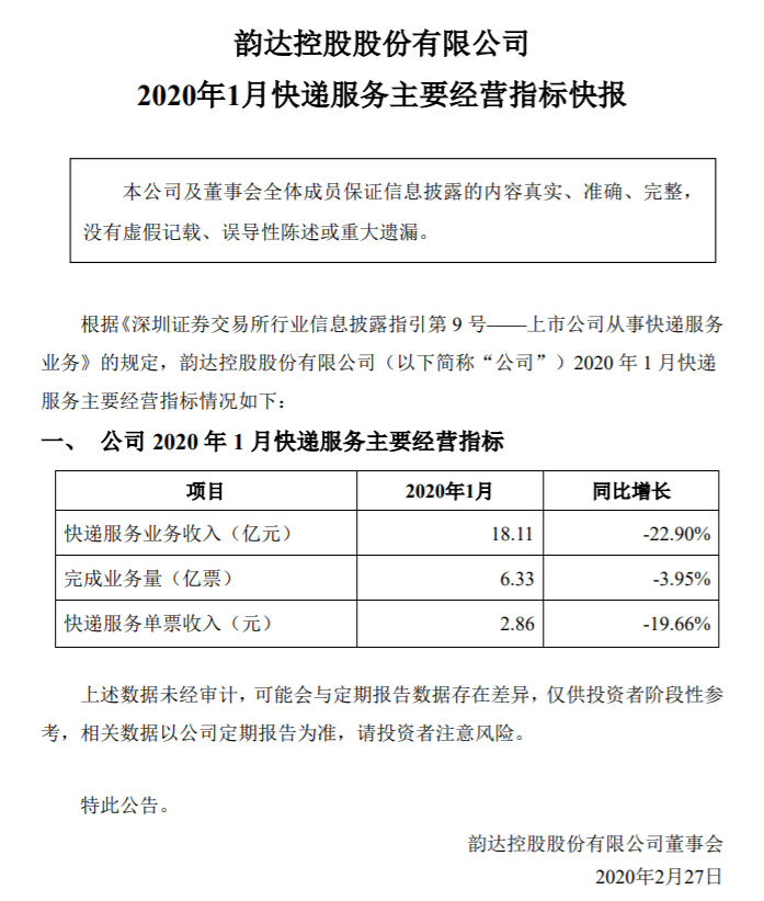 韻達股份:1月快遞服務業(yè)務收入同比下降22.9% 仙雯 ? 2020年2月27日 09:41 ? 快訊, 貨運物流 速途網(wǎng)訊 昨日,韻達股份發(fā)布公告稱,1月快遞服務業(yè)務收入18.11億元,同比下降22.9%。完成業(yè)務量6.33億票,同比下降3.95%??爝f服務單票收入2.86元,同比下降19.66%。 贊 (0) 仙雯 0 生成海報 圓通速遞:1月份快遞業(yè)務收入為17.23億,同比下降23.67% 上一篇 2020年2月27日 09:38 申通快遞業(yè)績快報:2019年營收230.67億元,同比增長35.58% 下一篇 2020年2月27日 09:43