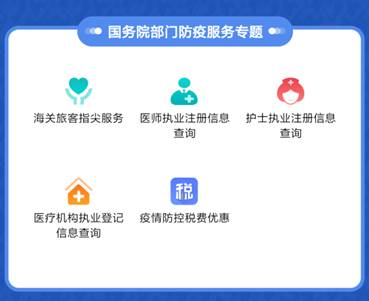 國務院部門防疫服務專題內已連接海關旅客指尖服務、醫師執業注冊信息查詢、護士執業注冊查詢、醫療機構執業登記信息查詢、疫情防控稅費優惠5個專項小程序,滿足了疫情期間群眾特殊的業務查詢、辦理需求。