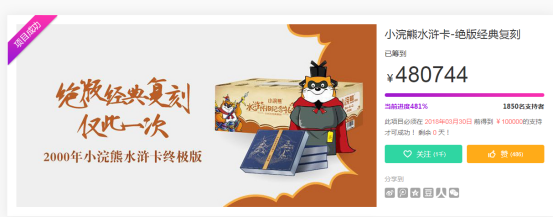 許是為了繼續(xù)收割情懷,2018年,統(tǒng)一小浣熊官方推出復(fù)刻版水滸英雄卡懷舊紀(jì)念品的眾籌活動,引發(fā)眾人關(guān)注。來自京東眾籌平臺上的信息顯示,該項(xiàng)目眾籌成功,至結(jié)束時已有1850名支持者,達(dá)到481%的進(jìn)度,籌款總額為480744元。