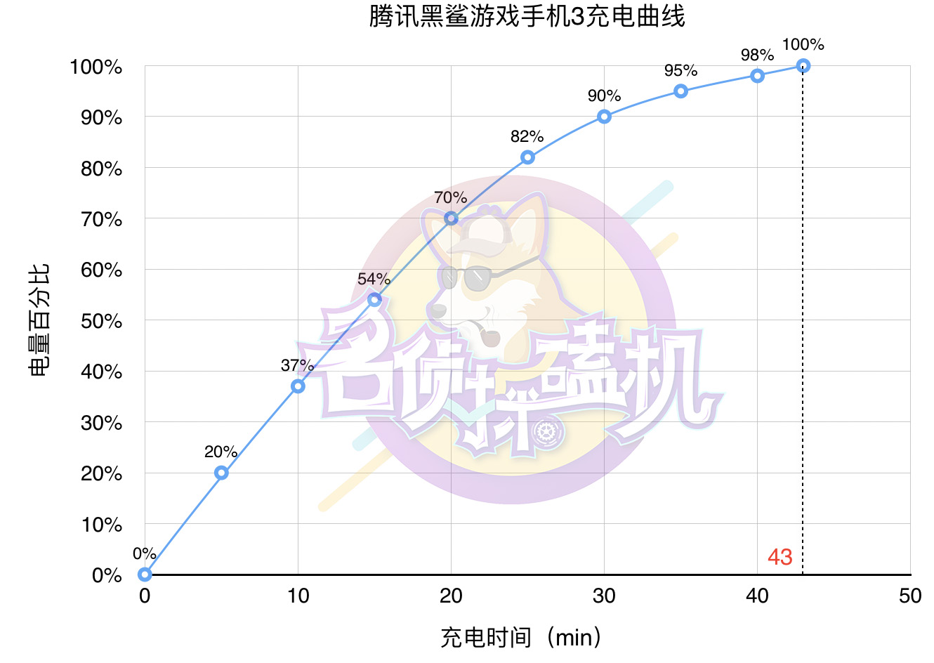 在充電方面,騰訊黑鯊游戲手機3采用65W有線快充的方式,實測15分鐘即可充電至54%,半小時即可完成90%充電,0-100%充電共耗時43分鐘。