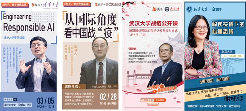 其實自2月份以來,快手網友們陸續從清華、北大、復旦、浙大、北師大等數十所頂尖高校的直播間在線觀看了“名校精品課”,透過小小的手機屏幕觀天下。