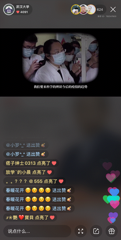 自強、弘毅、求是、拓新,在這場突如起來的疫情中,每個武大人都遵循學校校訓,在各自的崗位發揮力量。而武大作為疫區中心的高校,在輸送優秀人才之余,更是主動承擔起傳播知識、打破恐慌焦慮等責任,借助快手等短視頻平臺的天然優勢,通過信息透明化、正能量傳遞,讓更多人走進武漢的真實情況。