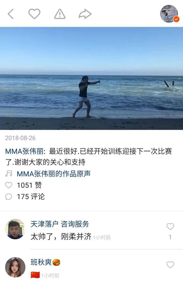 2017年,當時的張偉麗已經稱霸國內的搏擊賽事。她的目光正在注視著世界上更大的舞臺和更強的對手。她是天生的斗士,自嘲是個“機器人”。但她也在短視頻中展示著自己的另一面。