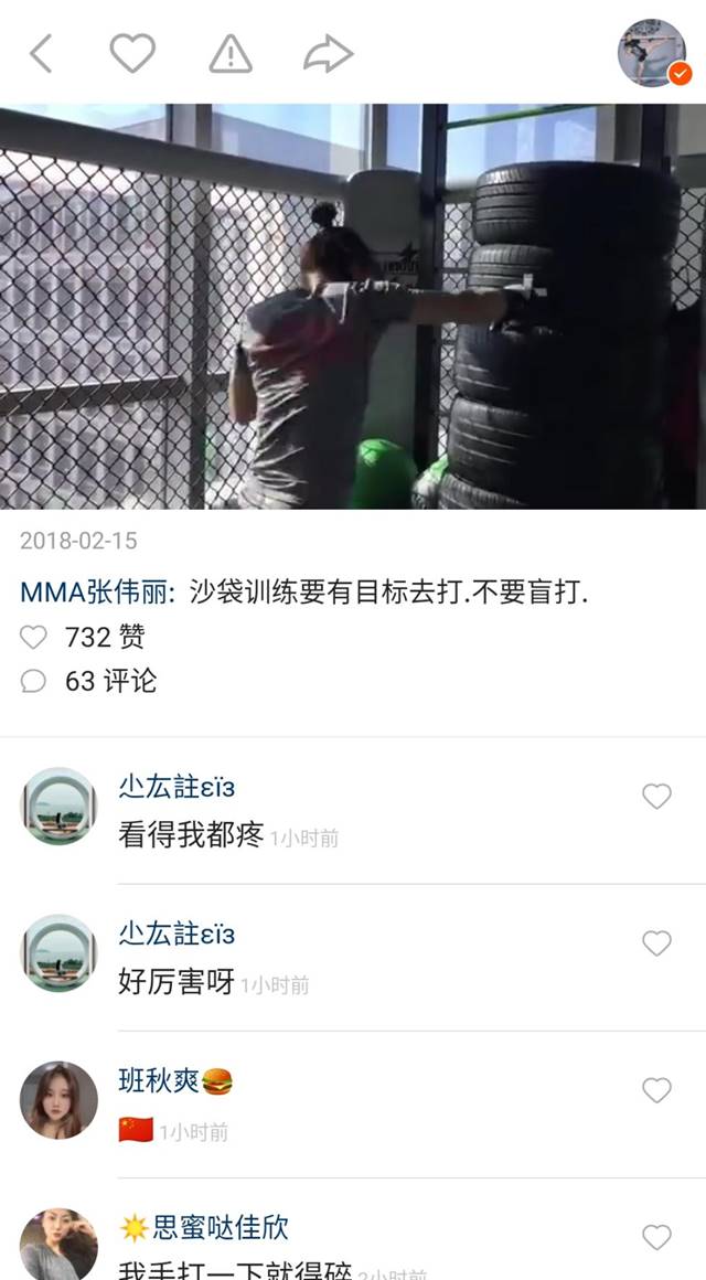 更多的時候,她在展示自己日常訓練。很難想象,這個姑娘曾經在保持俯臥撐的同時,還要接受電擊刺激肌肉收縮。她的沙袋是摞在一起的汽車輪胎,在上面用白色膠帶貼個十字靶心,拳頭有節奏地打在上面發出悶響,這意味著她的力道已經穿透了輪胎。雖然戴著拳套,但雙手仍然經常磨破皮。這些訓練,網友們光是看著就覺得疼,但這就是張偉麗每天的生活。