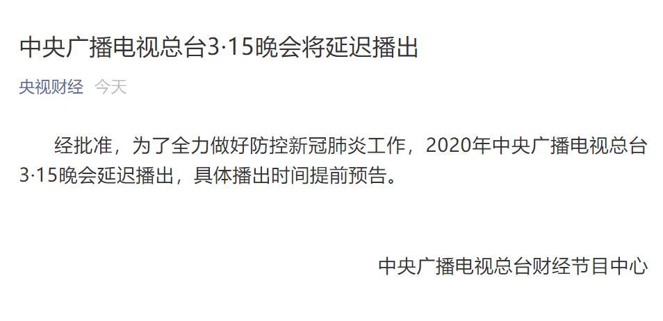 中央廣播電視總臺3·15晚會將延遲播出 仙雯 ? 2020年3月9日 09:37 ? 快訊, 資訊 速途網(wǎng)訊 今日,據(jù)央視財經(jīng)報道稱,為了全力做好防控新冠肺炎工作,2020年中央廣播電視總臺3·15晚會延遲播出,具體播出時間提前預告。 贊 (0) 仙雯 0 生成海報 華為預計今年手機出貨量將下降約20% 上一篇 2020年3月9日 09:35 飛豬推出首批5億元無抵押低息貸款,再為商家資金紓困 下一篇 2020年3月9日 09:46