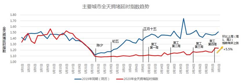 從交通出行方面來看,主要城市的道路雖然基本處于暢通狀態,但復工后的全天擁堵延時指數也呈增長趨勢。2月10號復工后擁堵較上一周僅上漲0.2%;復工第二周指數略有上漲,環比上周上漲4%;復工第三周環比第一周擁堵上漲5.8%;復工第四周的的周一和周二與復工第三周周一和周二相比,擁堵上漲5.5%。