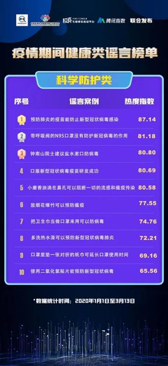 第二篇章《身邊的謠言》,主持人就帶領網友們解析了“科學防護類”謠言,其中不乏有買回家的蔬菜必須用75%酒精消毒才能確保食用安全, 電吹風強檔對面罩、面部和手部吹30秒就能消毒等生活中常見的錯誤引導。晚會邀請中科院青年科學家張宇識以脫口秀的形式,重點云打假了父母的朋友圈這個“坊間謠言聚集地”,將直播晚會推向第一個高潮。