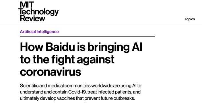 中國AI近期頻獲外媒關(guān)注。近日,麻省理工科技評論、Gigabit Magazine、PYMNTS在內(nèi)的國外科技、金融類媒體紛紛刊文,介紹百度AI最新成果,尤其是在近期疫情防中的AI戰(zhàn)疫經(jīng)驗。外媒認為,中國AI不容忽視,而中國AI企業(yè)百度被稱為“全球AI領(lǐng)導(dǎo)者”。