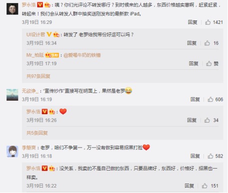 羅永浩宣布進軍直播帶貨后,OPPO副總裁沈義人便在評論區連發兩條問可否與羅永浩進行合作。威馬汽車沈暉也在線應援,稱威馬汽車可能是最大的智能硬件,一起來做第一場吧。