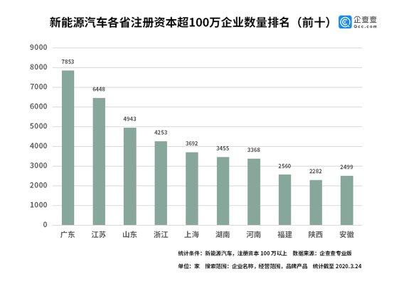 全國各省注冊資本超過1000萬元的新能源汽車相關企業中,廣東省的相關企業數量最多,共7853家,江蘇省和山東省分別以6448家和4943家居于第二和第三。