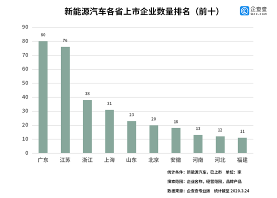 從上市企業數量來看,廣東省的新能源汽車相關上市企業數量最多,共80家。江蘇省和浙江省分別居于第二和第三,共有相關上市公司76家和38家,浙江省的相關企業數量為江蘇省的50%。