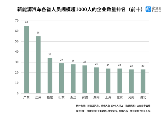 從員工規模上來看,各省新能源汽車企業中員工人數超過1000人的企業屬廣東省最多,共65家,江蘇省以55家次之,福建省共34家居于第三。
