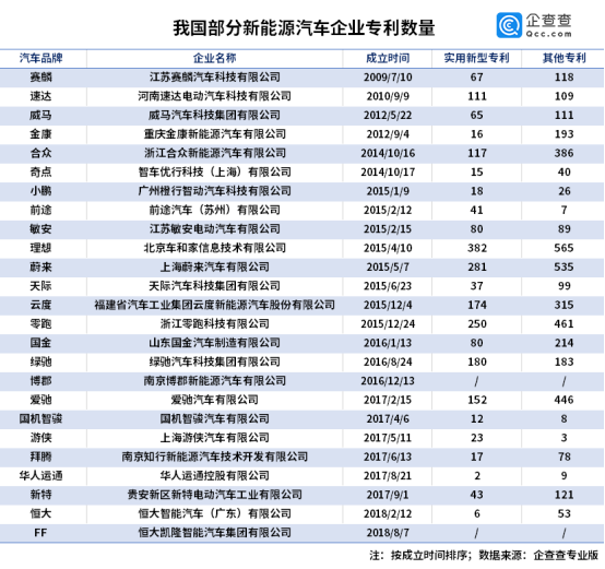 企查查數據節選了25家新能源汽車相關企業的專利數據,其中實用新型專利數量和其他專利數量最多的企業均為北京車和家信息技術有限公司,分別為382件和565件。實用新型專利數量超過百件的企業共有8家,占取樣企業總數的32%。