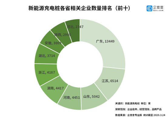 新能源汽車行業的發展,充電樁相關設備是基礎。企查查數據顯示,我國共有充電樁相關企業7.7萬家。廣東省的充電樁相關企業數量最多,共有1.3萬家,是第二名江蘇省的兩倍有余。山東省以0.5萬家相關企業數量居于第三。