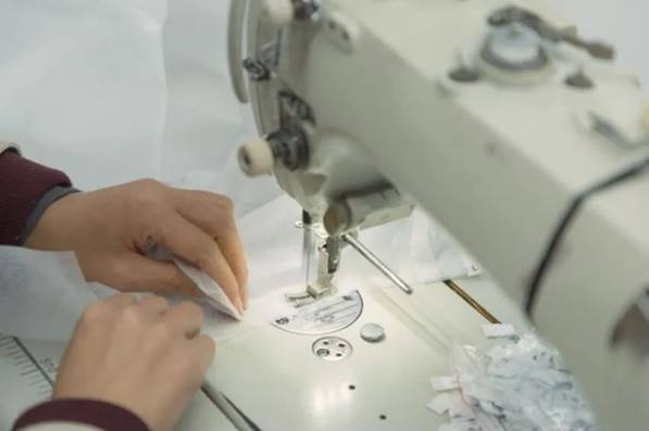 王萍萍回憶,防護服車間最“鼎盛”的時候,周邊服裝廠均派出熟練女工,70多個女工和她們的縫紉機、原料“攻陷”整個廠房,一天最多能做15000件。由于每個人都裝備了防護帽、口罩和防護服,乍一眼望去,飄逸的布料搭配女工們飛速移動的手腳,像極了武林爭霸現場。