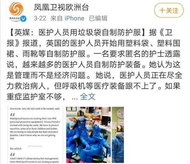 中國援意專家組組長裘云慶26日在接受《新京報》采訪時說,意大利當地醫療資源緊缺,一套防護服就像“奢侈品”;據《每日郵報》26日報道,美國紐約曼哈頓西奈山醫院,此前因醫療物資短缺,醫護人員不得不用垃圾袋當防護服。