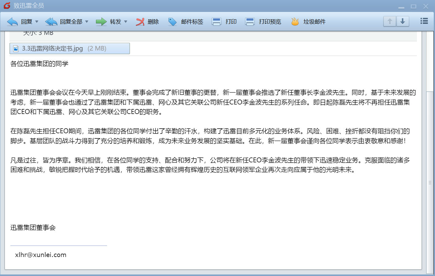 該內部信稱:“我們相信,在各位同學的支持、配合和努力下,公司將在新任CEO李金波先生的帶領下迅速穩定業務。克服面臨的諸多困難和挑戰,敏銳把握時代給予的機遇,帶領迅雷這家曾經擁有輝煌歷史的互聯網領軍企業再次走向應屬于他的光明未來。”
