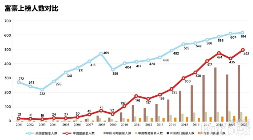 速途網訊 昨日,福布斯發布第34期全球億萬富豪榜。2020年,有2095位億萬富豪上榜,少于2019年的2153位。今年上榜富豪的財富總額為8萬億美元,少于2019年的8.7萬億美元。亞太億萬富豪數量最多,有778位;美國居次,有614位;隨后為歐洲,有511位。其中,中國內地新上榜人數最多。中國內地共有389位富豪上榜,財富總額達1.2萬億美元。