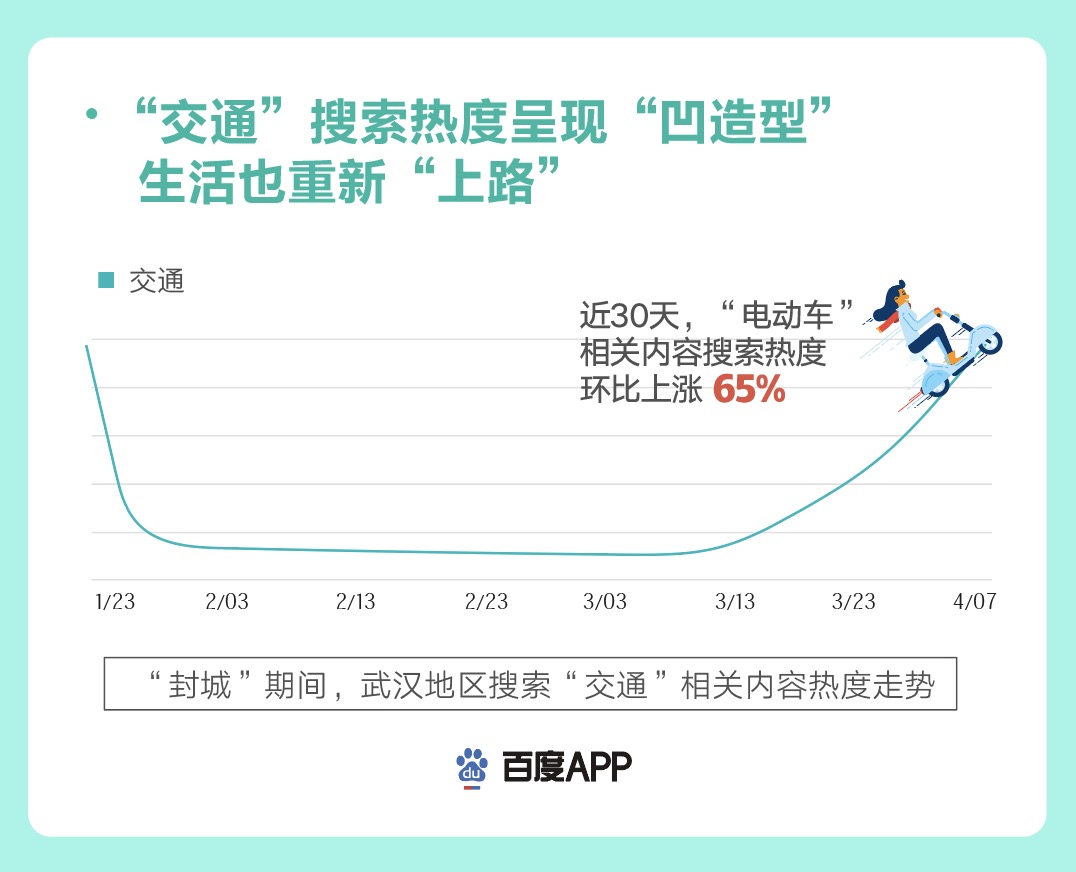 值得注意的是,交通復蘇也出現新變化。電動車憑借“全程與人零接觸、空氣更流通”的優勢,受到武漢網友的青睞。近30天,武漢地區搜索“電動車”相關內容熱度環比上漲65%。