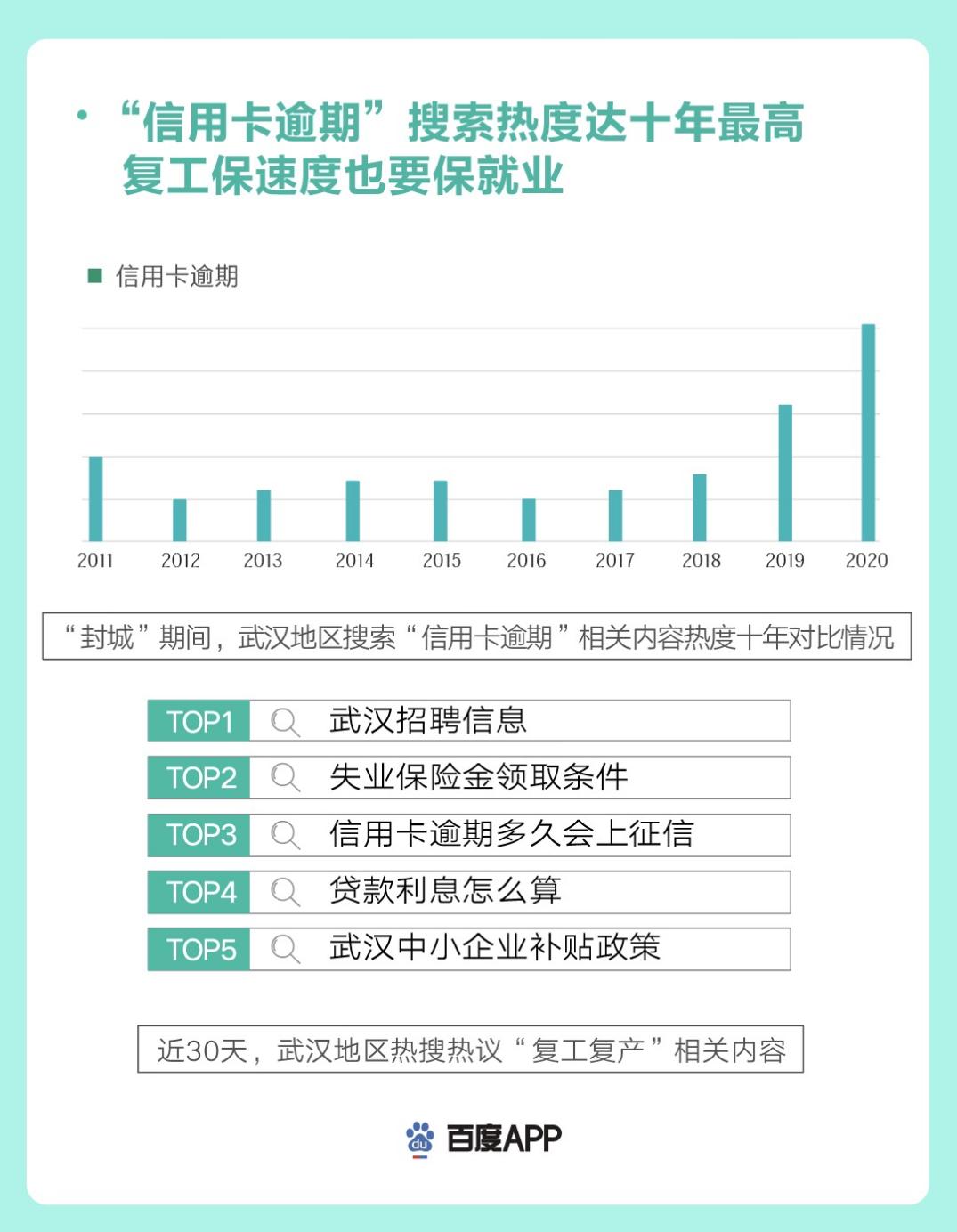 全面復蘇,復工加速時,武漢作為國內疫情中心,經濟受到的沖擊不應小覷。報告指出,近90天,武漢地區搜索“信用卡逾期”相關內容的熱度達十年來最高。超過兩個月的“封城”,給不少人的現金流造成了壓力。這也反映出當前武漢地區就業、社會保障仍面臨巨大壓力,正因如此,“武漢招聘信息”、“失業保險金領取條件”、“信用卡逾期多久會上征信”等均成為人們熱搜熱議的問題。