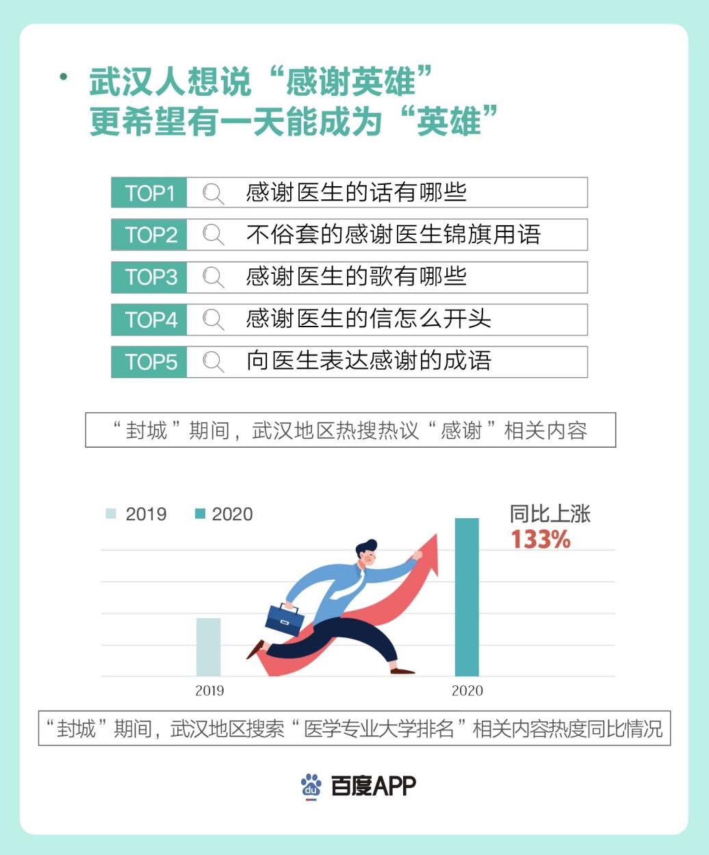 此外,武漢網友對援漢、援鄂醫療隊的感謝也都藏在搜索框里。報告顯示,“感謝醫生的話有哪些”、“不俗套的感謝醫生錦旗用語”等均是搜索“感謝”相關的熱門內容。醫生的榜樣力量更影響著武漢的下一代,“封城”期間,武漢地區搜索“醫學專業大學排名”相關內容同比上漲133%,更多人產生從醫意愿。