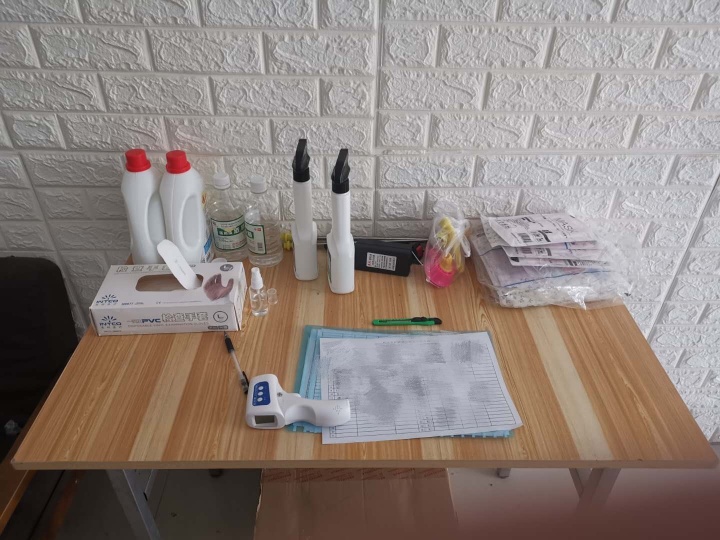 工廠門口放著一張紅布罩著的長桌,擺著口罩、除菌洗手液、額溫計和幾張印有180名員工信息的名單。原本感性的李新文此刻沒有過多言語,復工的激動和重啟的壓力交織在一起。