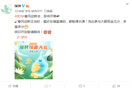 今日,綠洲官方微博發文表示,春風迎新正當時,邀好友填邀請碼即可憑水滴參與瓜分大額現金。事實上,這并不是綠洲首次探索現金拉新,據速途網觀察,春節期間綠洲也曾有過嘗試。