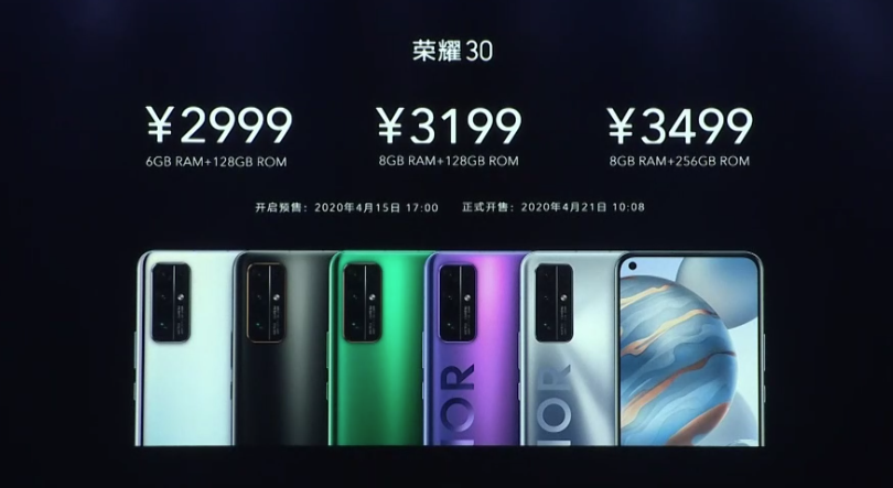 售價方面,榮耀30 6GB+128GB版、8GB+128GB版和8GB+256GB版價格分別為2999元、3199元、3499元。榮耀30 Pro 8GB+128GB版和8GB+256GB版價格分別為3999元、4399元。榮耀30 Pro+ 8GB+256GB和12GB+256GB版價格分別為4999元、5499元。4月15日17:00正式開啟預(yù)售,4月21日10點08分,榮耀30系列手機(jī)將于華為商城、各大授權(quán)電商、榮耀授權(quán)體驗店全平臺開售。