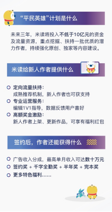 據(jù)速途網(wǎng)了解,米讀此次斥資10億元打造的作者扶持計劃中,包括為網(wǎng)文創(chuàng)作者提供定向的流量扶持,專業(yè)運(yùn)營服務(wù)和高額的獎金激勵。新人作者上架、更新作品即可享有福利紅包,與米讀簽約后還可享有簽約獎、千字全勤獎、半年獎、完本獎、渠道分成等多項(xiàng)政策扶持。單個作者可享受福利金額不設(shè)上限,優(yōu)秀作者全年更能獲得上百萬的額外扶持。