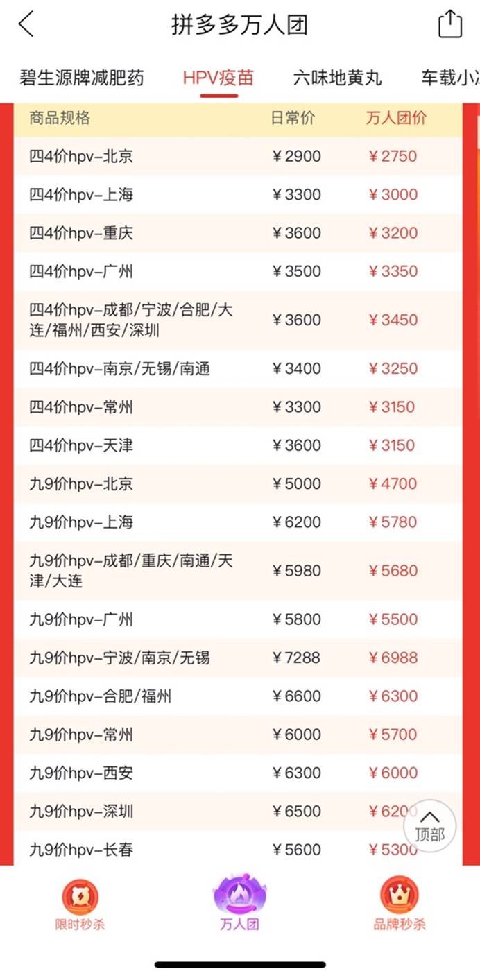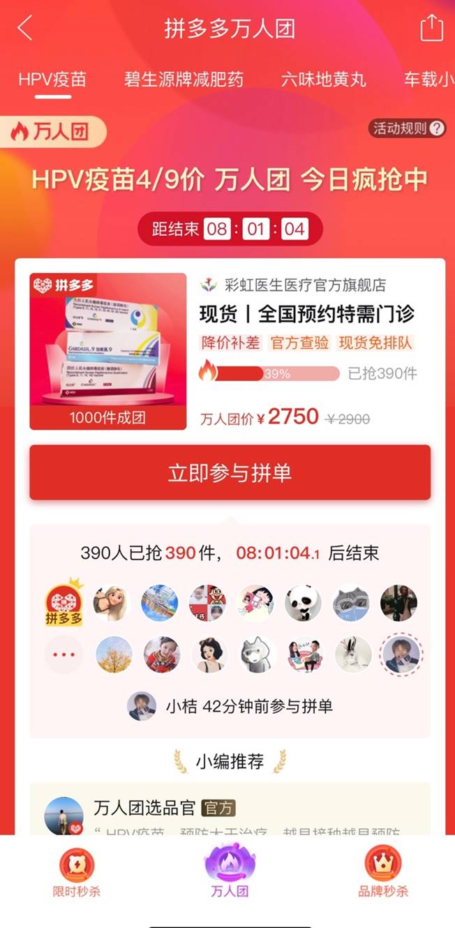 HPV現(xiàn)貨疫苗登陸拼多多“秒殺萬人團(tuán)”,百億補(bǔ)貼擊穿線上線下底價(jià)